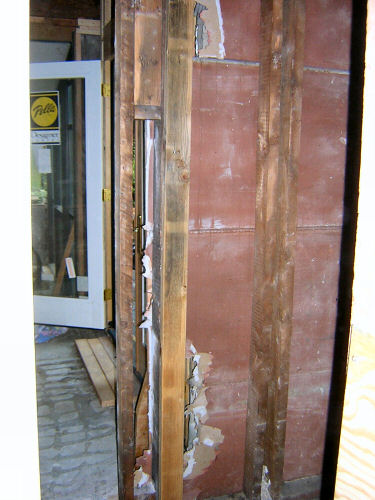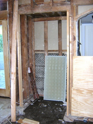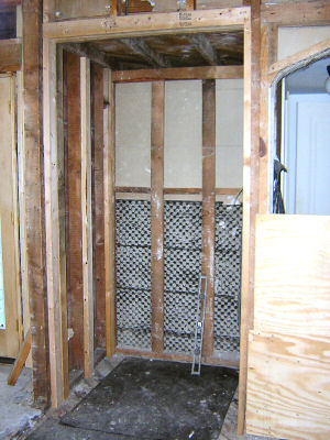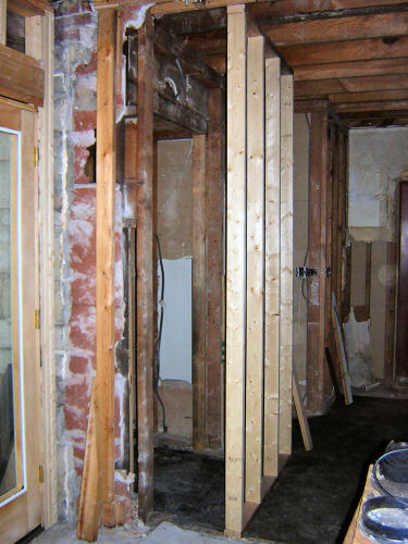 | 9/12 Opened up alcove, framed. By raising the height of the header at the top of the alcove, there will be room above the fridge for a cabinet - thus helping the "built-in" look. An unexciting detail that will be important later. |